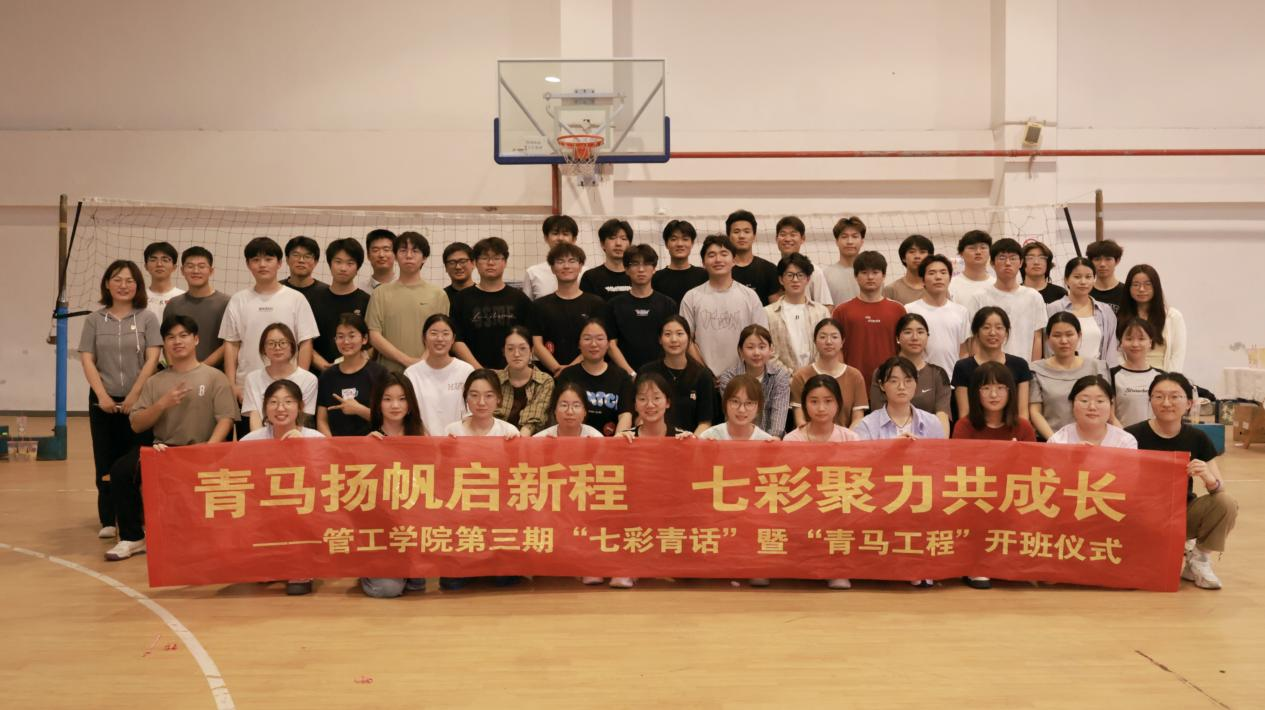 在秀山校区汇文a502、体育馆举办第三期“七彩青话”暨“青马工程”开班仪式。活动由院团委书记赵玉婷主持,院党委书记王军,院党委副书记、纪委书记、副院长赵颖,各年级辅导员代表及本期学员、学院第十一届、十二届团学骨干参加。