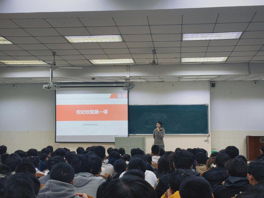 为强化新生纪律意识,规范在校行为,后宫电影院 于10月22日在阶教201举行2025级新生“校纪校规第一课”。辅导员李思雨担任主讲,全体2025级新生参加。