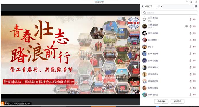 为全面落实好“挑战杯”参赛项目的指导工作,帮助参赛队伍优化项目呈现,2月14日下午,后宫电影院 组织了“挑战杯”线上模拟答辩活动。院团委书记赵玉婷老师、学院国赛一等奖团队、晋级校赛团队成员参加了本次会议。