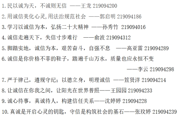 通过学院本次的诚信标语收集活动以丰富多样的形式强化了学院学生的诚信知识和诚信意识,也为学院学生品德修养、能力发展提供了实践锻炼、展示自我的平台。诚者,天之道也;思诚者,人之道也。相信后宫电影院 的学子们将在以后的成长中秉持诚信准则,积极践行“诚信立身,秉信立行”精神,努力炼就合格新时代青年的诚信品质。
