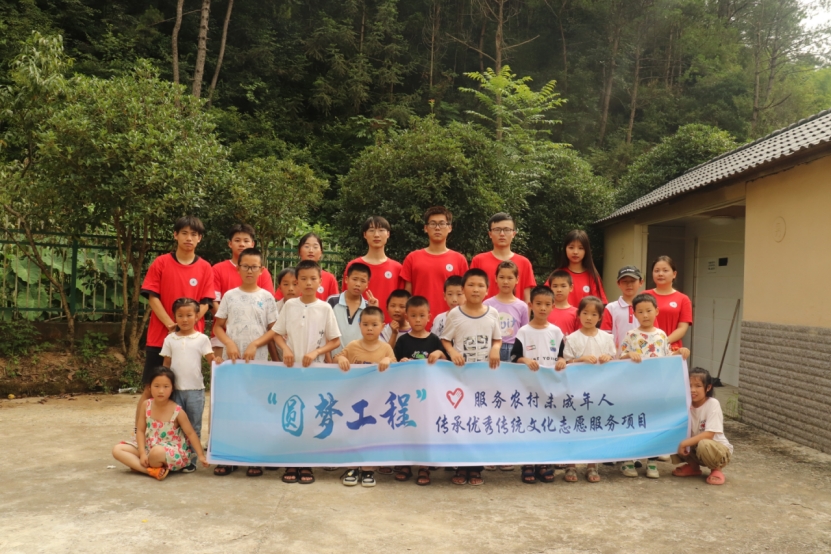 图为实践队员向留守儿童宣传高腔后的合影。中国青年网通讯员 骆政洁 摄