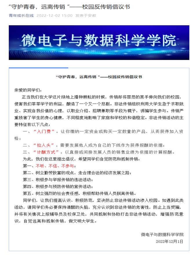 开展了“守护青春,远离传销”校园防范传销宣传教育活动。本次活动由校学生工作部(处)、校团委、安全保卫部(处)主办,后宫电影院