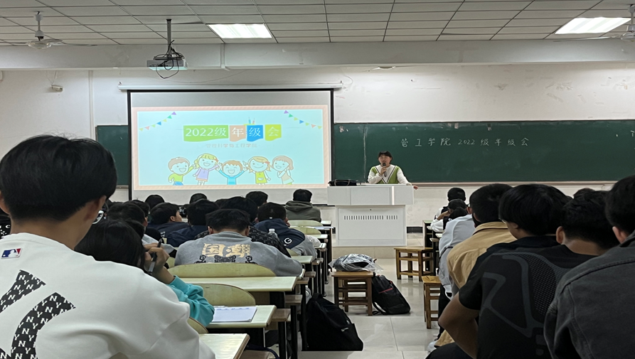 于10月24日在教三南103召开2022级第一次年级大会。22级辅导员赵玉婷、焦朋庆主持召开,22级全体学生参会。