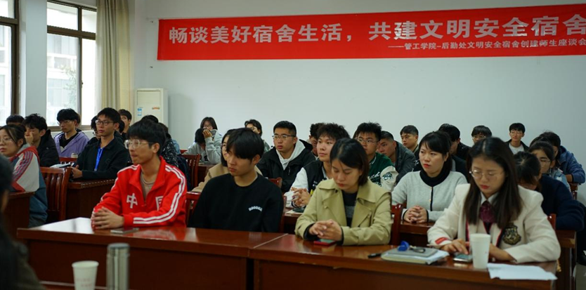 联合后勤处于汇文楼A308召开文明安全宿舍创建师生座谈会。后勤处学生公寓管理服务中心主任涂必华、各楼栋宿舍管理员、院团委书记万媛媛、全体辅导员、学生干部及寝室长代表参加座谈会。