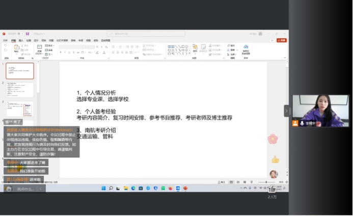 举办了线上考研经验交流会,选取了工业工程、工程造价、物流工程和信息管理与信息系统专业6名优秀学生代表进行宣讲,宣讲人分别为东南大学、中国矿业大学、南京航空航天大学、合肥工业大学、武汉理工大学、大连海事大学2022年拟录取硕士研究生。