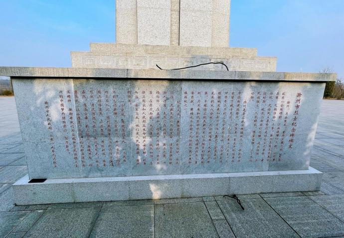 跟随王昕彤迈入基地的刹那,一股沉重的气息就将我们一行人包围,巨大而又刚毅的石碑屹立着,历史的厚重气息,让我怀着无比的敬意,走到了烈士纪念碑面前。滁州,吴头楚尾,自古就有“金陵锁钥,江淮保障”之称。抗战时期,滁州也是著名抗日根据地之一,中原局进驻滁州时,在许多老一辈无产阶级革命家中都留下战斗痕迹,这是伤痕,也是荣耀。一九三九年十二月到一九四零年二月的三次中原局会议,为华中抗日根据地的发展和新四军的壮大奠定了坚实基础。半塔保卫战更是新四军以少胜多的经典战例,也使滁州更加荣光。这载入滁州市烈士纪念碑的碑文,是滁州的历史,也是滁州的光辉,每一个字句标点后,都是无数人的努力与牺牲!