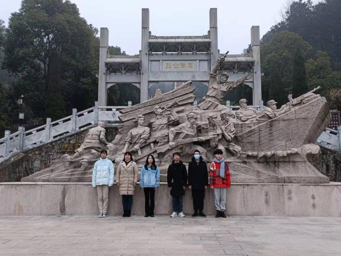 图为实践队员在烈士陵园门口雕像处合影。阮旸 摄