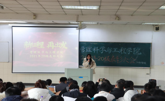 大会上,主持人宣读了受表彰学生名单。王诚、江辉、周春柳、赵丹、蒋高鹏、高飞、辜继明、杨金星等班主任代表和辅导员分别为受表彰学生颁奖并合影留念,这进一步激发了学生的身份认同感、荣誉感,极大地增强了教育学生本人及他人的针对性、实效性。来自工程造价、工业工程、物流工程以及信息管理与信息系统4个专业的8位同学作为优秀学生代表分别就学习、生活、工作等方面的成长奋斗历程与成就讲述了自己的见解与有关方法。先进学生代表方明娟在发言中,介绍了学习经验,分享了个人的学习经历与成长感悟,感谢了学校和老师的辛勤培养,做出了志存高远、德才并重、情理兼修、勇于开拓,在火热的青春中放飞人生梦想,在拼搏的青春中成就事业华章的号召,在20级学生中反响热烈。