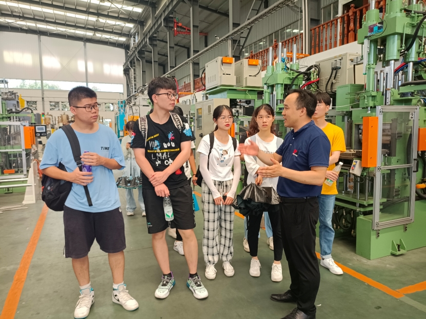 图为实践队员了解公司医用橡胶瓶塞机在疫情期间对疫苗生产起到的重要作用