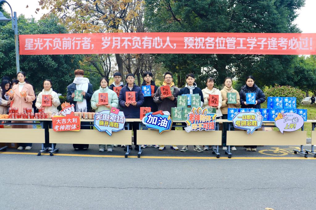 在秀山校区图书馆前开展了“温暖相伴,逐梦研途”考研慰问活动。学院党委书记王军,院党委副书记、纪委书记、副院长赵颖,毕业班辅导员任静、钱丹丹及2025届考研学生参加本次慰问活动。