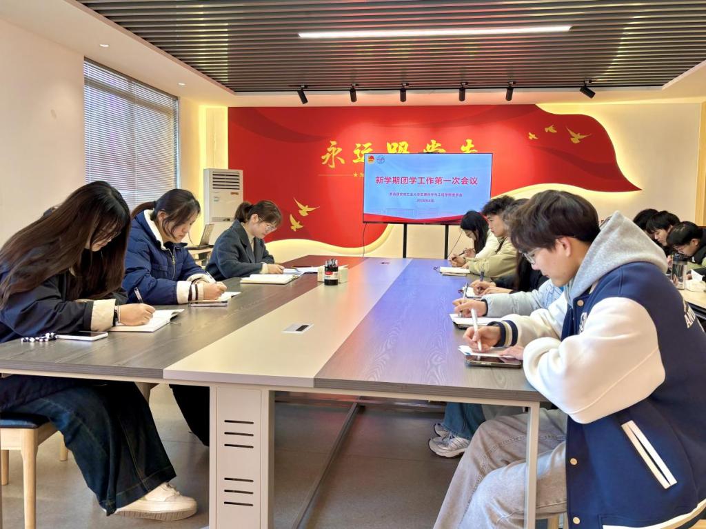 团委在汇文楼A502召开新学期团学工作第一次会议。会议由院团委书记赵玉婷主持,团学组织各部门负责人参加。