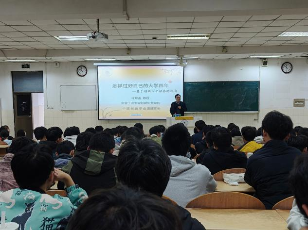 于阶教101开展《怎样过好自己的大学四年——基于创新人才培养的视角》的讲座。本次讲座由学院党委副书记、副院长、纪委书记赵颖主持,创新创业学院教授冷护基主讲,2024级全体学生参与。