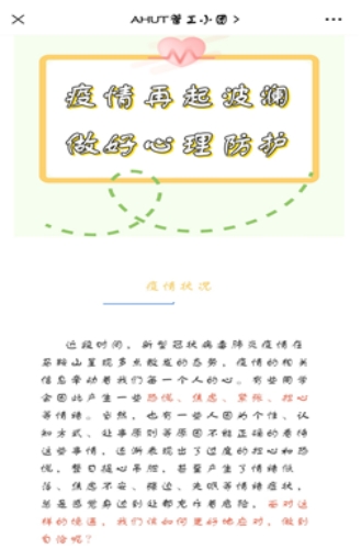 热切关注学生心理健康状态,第一时间梳理疫情影响下学生心理诉求,开展了形式多样的心理健康教育活动,对于当前维护和促进大学生心理健康发展具有重要意义。