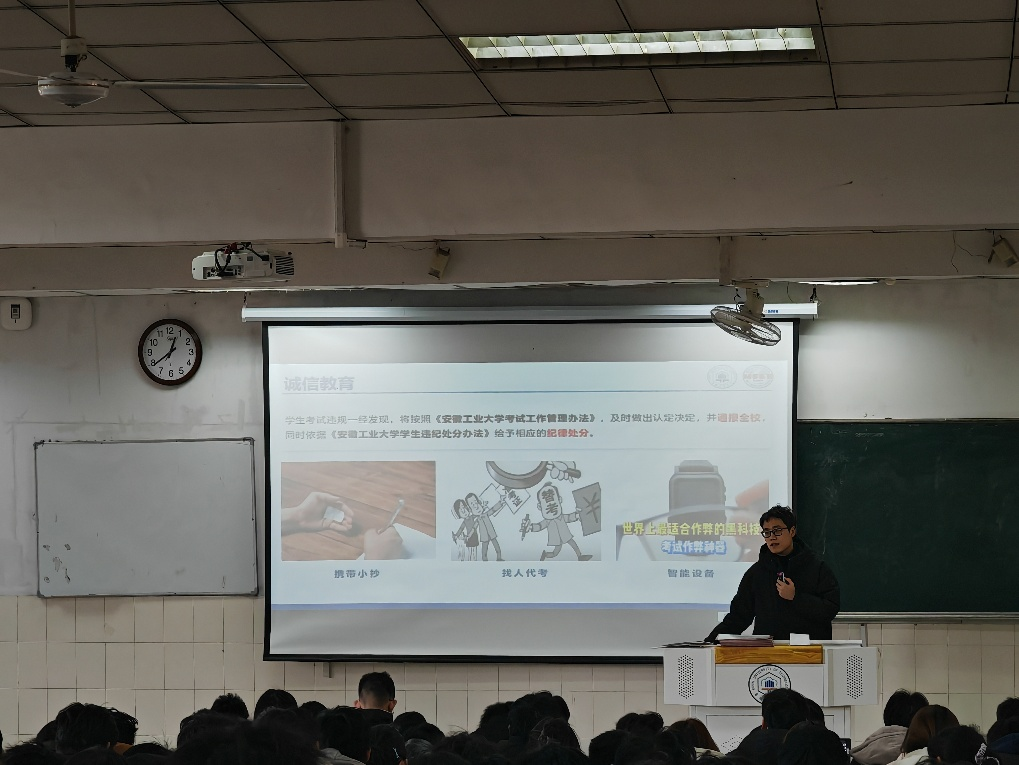 会上,曹宇对本学期年级各项工作进行简要总结,肯定了同学们在学科竞赛、社会实践、文体活动中的亮眼表现,引导学生利用寒假时间,提前做好未来规划,实现自我能力提升。钱丹丹聚焦学风诚信、考试规范等核心议题,提醒大家合理规划复习时间,梳理知识重点,以扎实的准备从容应考,拒绝投机取巧,同时结合校园考试违纪典型案例,逐一剖析违纪情节及长远影响。最后,曹宇围绕交通安全、消防安全、用电安全、文明离校等主题开展假期安全专项教育,叮嘱同学们离校前务必做好宿舍安全检查,完善离校登记手续,保持宿舍整洁有序。