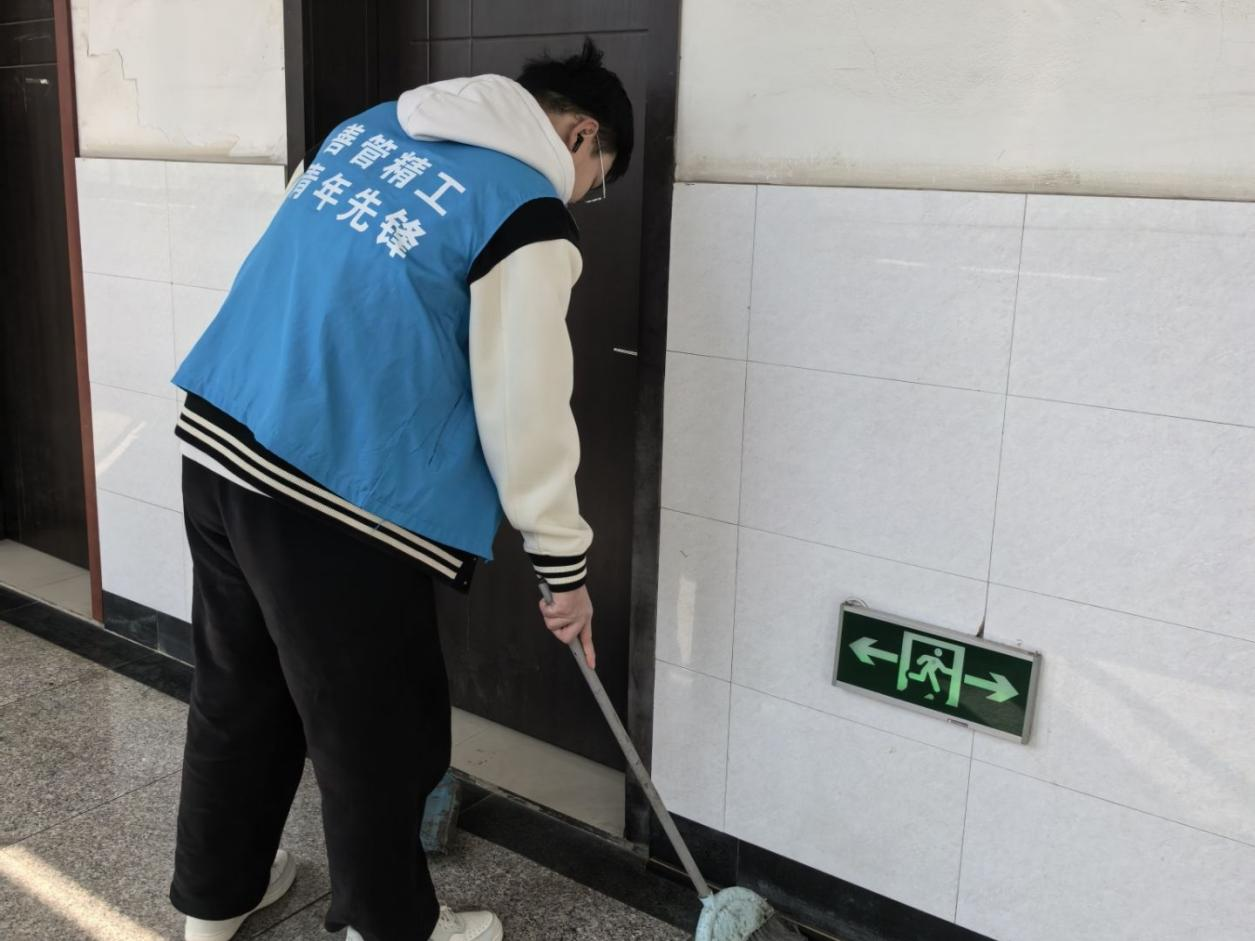 活动开始前,楼宇负责人围绕清扫区域、整理标准及安全注意事项,对志愿者们进行了岗前分工与说明。清扫过程中,志愿者们分工协作、配合有序,重点对大厅、走廊、楼梯间等公共区域的地面垃圾、墙角积尘、墙面污渍进行了清理,并对公共物品进行规范整理。工业工程254班关航生在参与活动后表示:“这次清扫让我感受到,雷锋精神并不遥远,它就体现在一次次俯身、一次次擦拭里。用双手让校园环境变得更整洁,是一件踏实而有意义的事。”