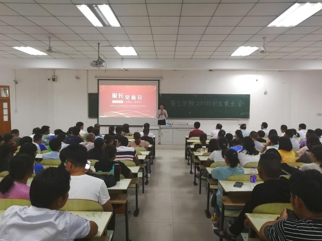 院党委书记汪春胜从学校简介、师资力量、办学理念、办学成果和人才培养五个方面向家长们展开了介绍。随后就19级新生基本情况、学生工作情况、学生日常管理、安全问题、毕业生去向等家长关注的问题进行讲解。同时,将学生工作重点总结为“一四五”,即紧紧围绕“立德树人”这一根本任务,实施“四大工程”,引导学生唱好“五首歌”。强调当代大学生应立足于当下,脚踏实地,提高辩证思维能力,肩负起国家和民族的希望,努力向前。新生班主任代表学工部副部长卫军帅强调要提高学生的底线意识,提高学院各组织的合力意识,同时阐述了学生工作处“不让一个学生掉队”的工作理念。