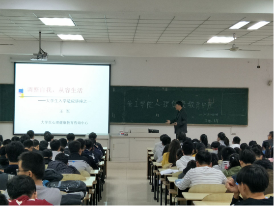 10月23日下午,后宫电影院 在本部教三南103举办以“调整自我,从容生活”为主题的大学生入学适应教育讲座。校学工部副部长、大学生心理健康教育咨询中心主任王军主讲,后宫电影院 全体新生到场参加。