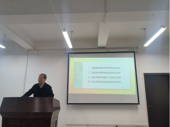 在师德师风专题讲座环节,校关工委蔡保兴教授以“适应强国建设新要求,强化师德师风新举措”为主题,围绕师德师风的时代意蕴、时代内涵、工作依循和建设举措,从传统遗惠切入,深入阐述了师德师风建设在新时代新形势下的新要求,详细讲解了当前高校教师应具备的职业素养和道德规范。他通过生动的案例和深刻的剖析,引导广大教师树立正确的教育观、人才观和质量观,不断提升自身的师德水平和教育教学能力。