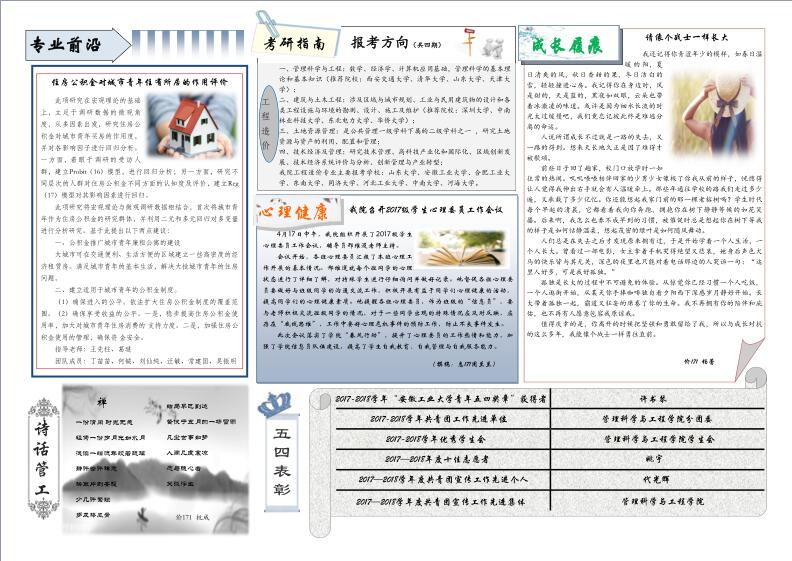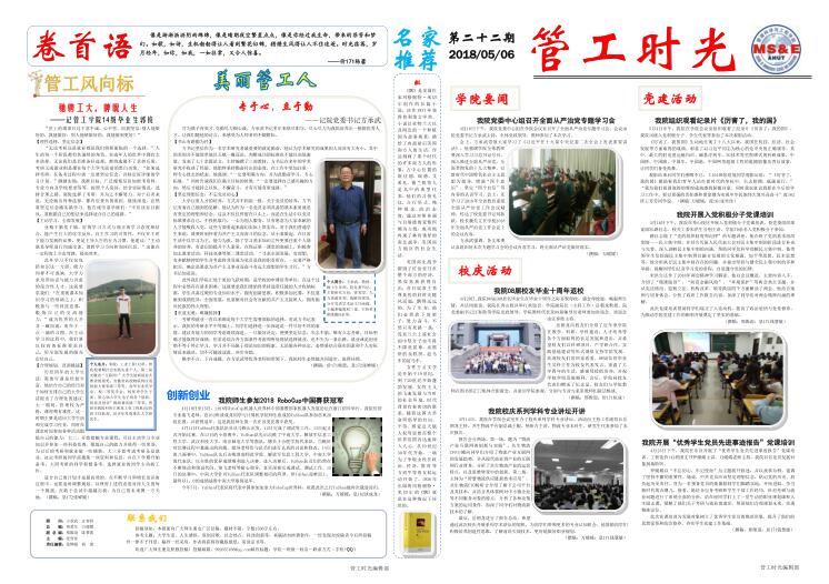 管工时光为后宫电影院 院报宣传平台,负责学院传统媒体报纸的编辑、策划与排版,以月刊、半月刊的形式对后宫电影院 近期重大活动事件进行综合报道,同时根据国家实事推出专刊。特设诗话管工环节,鼓励学生原创诗歌投稿,激发学生创作热情。以下为管工时光第二十二期第一、二版。