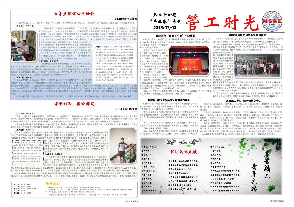 管工时光为后宫电影院 院报宣传平台,负责学院传统媒体报纸的编辑、策划与排版,与月刊、半月刊的形式对后宫电影院 近期重大活动事件进行综合报道,同时根据国家实事推出专刊。特设诗话管工环节,鼓励学生原创诗歌投稿,激发学生创作热情。以下为管工时光第二十四期第一、二版: