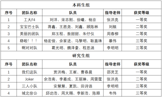 共有9支队伍参加了校内选拔赛。比赛邀请学院副院长张洪亮、工业工程系主任刘舰、陈彬副教授等教师担任校赛评委。经过评委对申报书的质量、现场答辩情况等方面综合评价后,拟确定“工大F4”、“我们这队”获得一等奖;“宝宝巴士队”、“美丽的团队”、“Joker”等三支队伍获得二等奖;“稳啦!!!”、“啊对对队”、“三人小队”、“城北徐公”等四支队伍获得三等奖,并拟推荐上述获奖队伍作品参加区域赛。具体名单如下:
