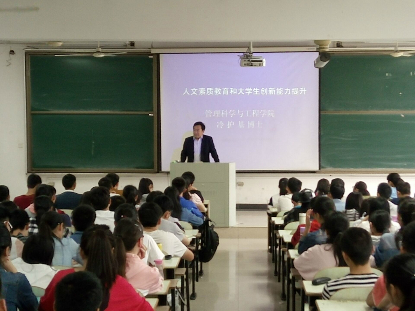 邀请创新学院院长冷护基教授于本部教三南401举行人文素质教育和大学生创新能力提升讲座,院党委副书记汪春胜、团委书记兼15级辅导员周爱军老师以及2015级近200名同学出席聆听,现场座无虚席。